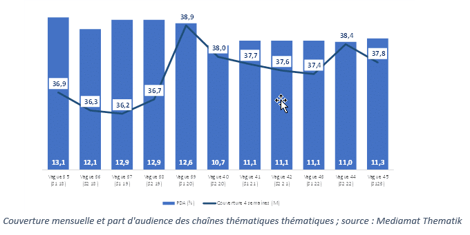 - Un ancrage dans le public construit depuis trois décennies, qui n’a jamais été aussi élevé : les chaînes thématiques sont aujourd’hui disponibles dans plus de 8 foyers sur dix, soit près de 24 millions.